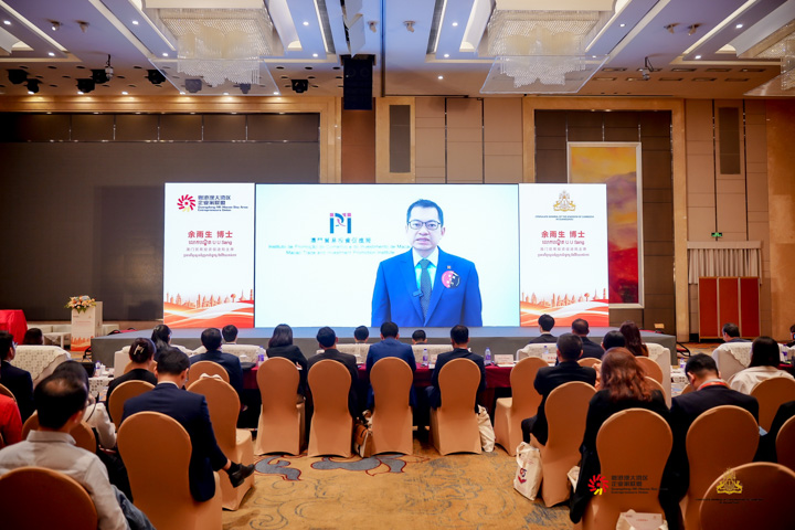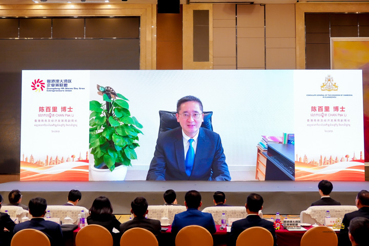 香港商务及经济发展局副局长陈百里博士、澳门贸易投资促进局主席余雨生博士进行视频致辞,对本次盛会表示祝贺,期待大会为粤港澳、柬埔寨企业创造更多合作商机。