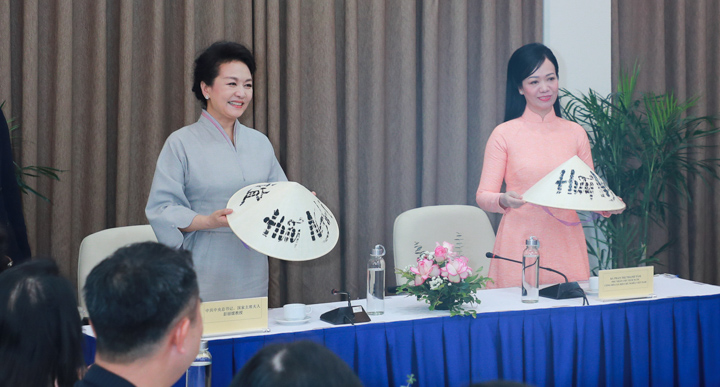彭丽媛夫人听取了河内国家大学创建、办学、开展国际交流等方面情况介绍,希望双方进一步加强教育交流合作,欢迎更多越南青年到中国留学,增进相互了解和友谊。
