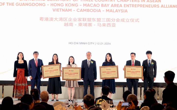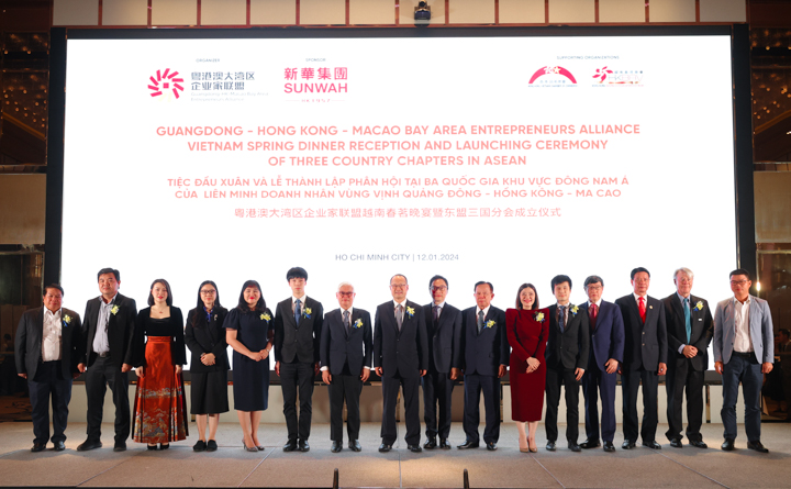 粤港澳大湾区企业家联盟的越南春茗和越南胡志明、河内,柬埔寨金边以及马来西亚吉隆坡四个分会成立仪式今天在胡志明市隆重举行。越南平阳省省委书记阮文利、香港驻新加坡经济贸易办事处处长冯浩然、胡志明市投资贸易促进中心副总经理高氏飞云等出席活动,中囯驻胡志明市总领事魏永祥发表视频致辞。仪式还吸引了来自越南以及中国粤港澳大湾区各商协会、企业的300多名高层领导、专家代表参与。本次活动亦被评为胡志明市2024年促进国际贸易交流合作领域的第一个标志性活动。