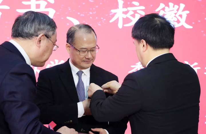 上海大学党委书记成旦红教授和校长刘昌胜院士分别为蔡冠深博士颁发了聘任证书及佩戴上海大学校徽。