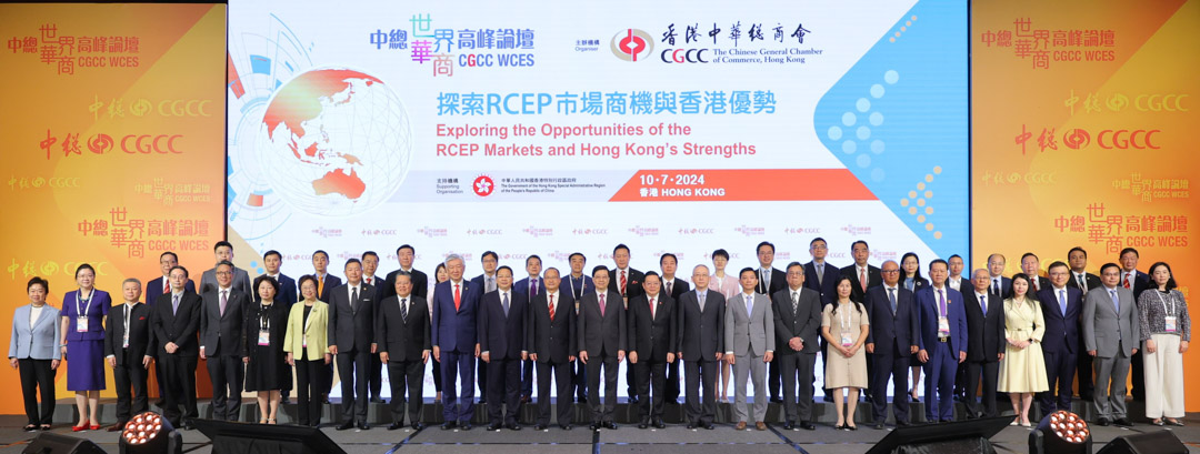 由香港中华总商会(中总)主办的“2024中总世界华商高峰论坛”,7月10日于香港会议展览中心举行。论坛以“探索RCEP市场商机与香港优势”为主题,邀请本地及RCEP地区多位主要官员、华商领袖、企业精英等,共同探索RCEP最新发展情况,并探讨如何发挥香港的独特优势,推动与华商携手开拓RCEP市场庞大机遇。香港特首李家超、中央驻港联络办副主任尹宗华、外交部驻港特派员公署署理特派员李永胜及东盟秘书长高金洪应邀担任主礼嘉宾。