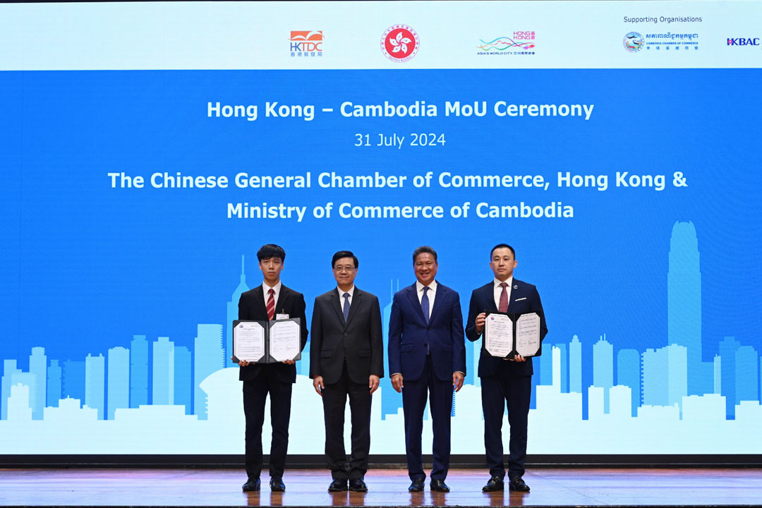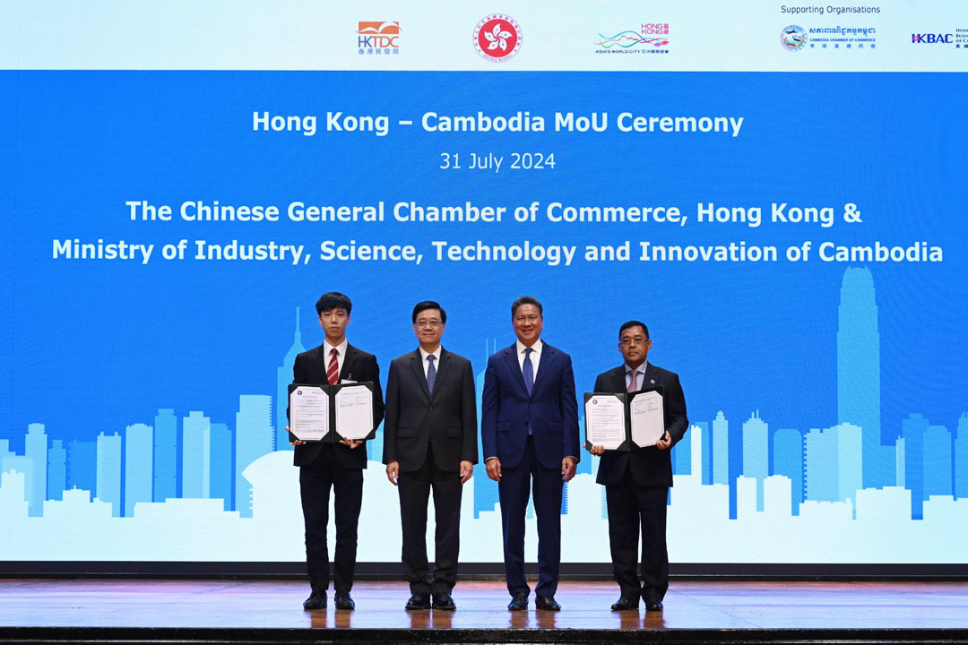 在由香港驻曼谷经济贸易办事处和香港贸易发展局共同主办的商务午宴上,在特首李家超、柬埔寨副首相孙占托见证下,蔡卓思作为代表与柬埔寨工业科技创新部与商业部签署合作备忘录。