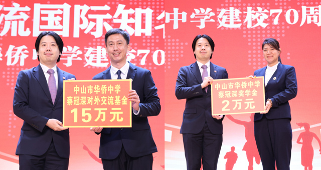 会上还颁发了“蔡冠深对外交流基金”、“蔡冠深奖学金”等多项奖学金,中山市华侨中学校董会副董事长蔡隽思上台为师生颁奖。
