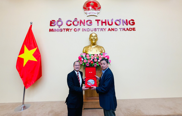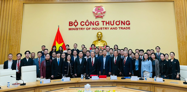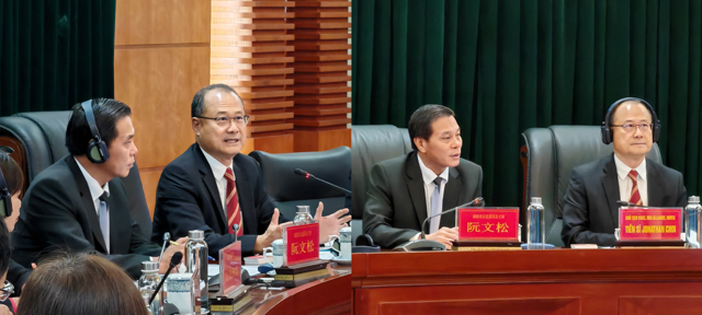 同日下午,考察团一行访问越南工业贸易部,与部长代表、亚洲—非洲市场司副司长苏玉山进行座谈。苏玉山副司长代表部长热烈欢迎蔡博士一行到访工贸部,并会同进出口局、多边贸易政策局、工业局、贸易促进局等负责人,与大湾区企业家探讨合作。