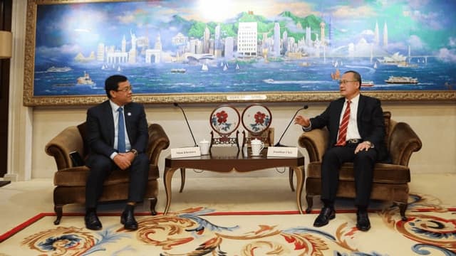 1月10日,全国政协常委、香港中华总商会会长、粤港澳大湾区企业家联盟主席、澳门六合彩开奖结果主席蔡冠深博士,在中总接待率团到访的柬埔寨工业科技创新部国务秘书NHIM Khemara(副部级)、驻港总领事李素文一行。双方围绕柬工业及科技创新,中小企业与手工业等合作进行探讨。