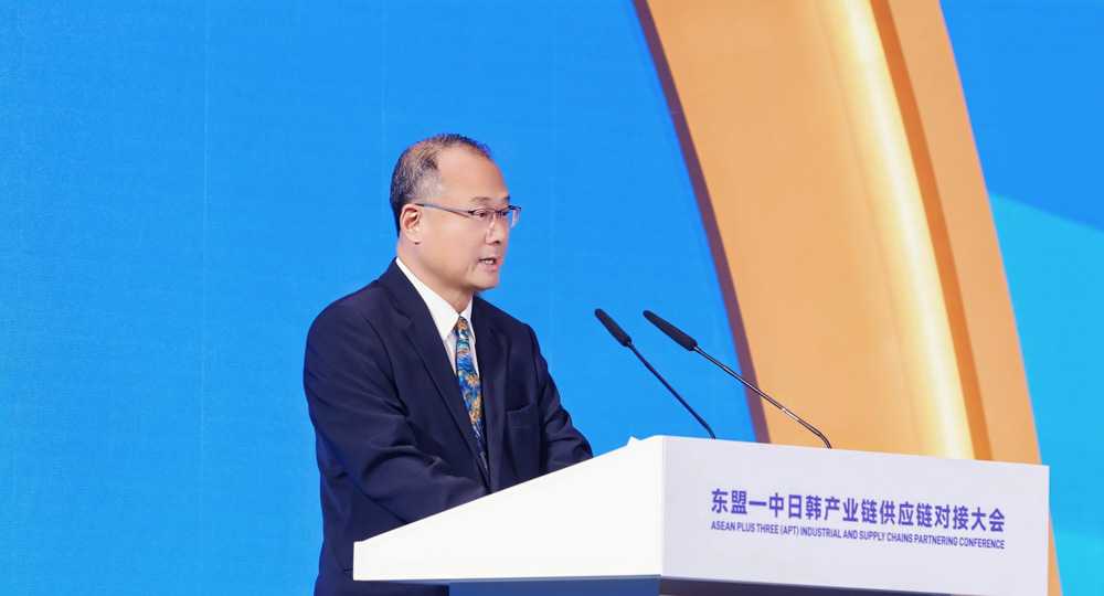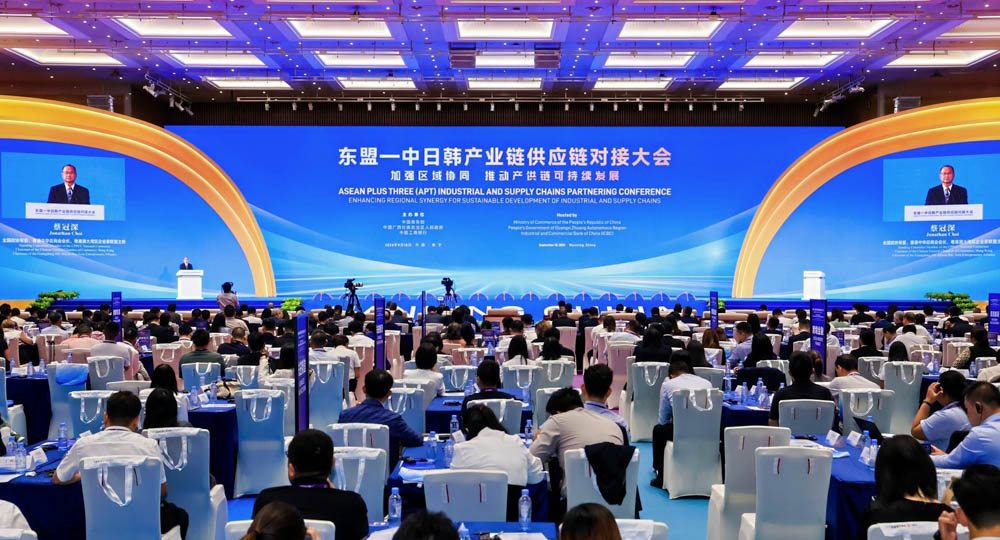 2025年9月18日上午,以“加强区域协同 推动产业链供应链可持续发展”为主题的东盟—中日韩产业链供应链对接大会在南宁举行。商务部副部长鄢东、广西壮族自治区人民政府副主席胡帆、中国工商银行行长刘珺、柬埔寨商业部国务秘书桑兴波拉、韩国中小企业部崔承宰次官等出席大会并致辞。