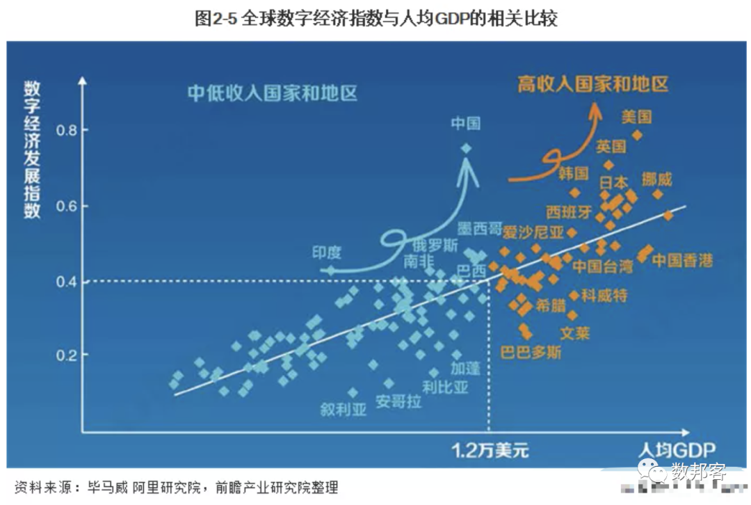 在全球的数字经济发展中,数字经济的发展指数与地区或国家的人均GDP呈现高度相关,在人均GDP超过1.2万美元的地区或国家中有美国、英国、日本、韩国、西班牙等,其数字经济发展指数均超过0.4,高于人均GDP低于1.2万美元的地区或国家。