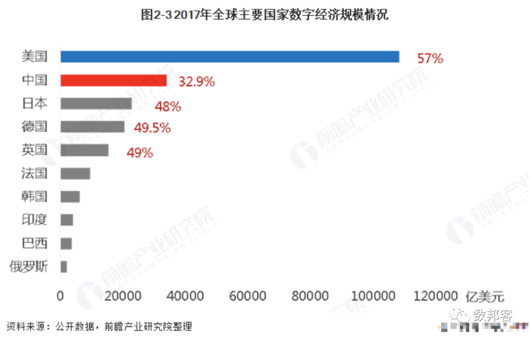 全球数字经济呈现出蓬勃发展之势,其中2017年,美国数字经济规模占美国GDP的57%,驱动能力强,位列全球第一;中国数字经济规模为27.2万亿元,占中国GDP的32.9%。