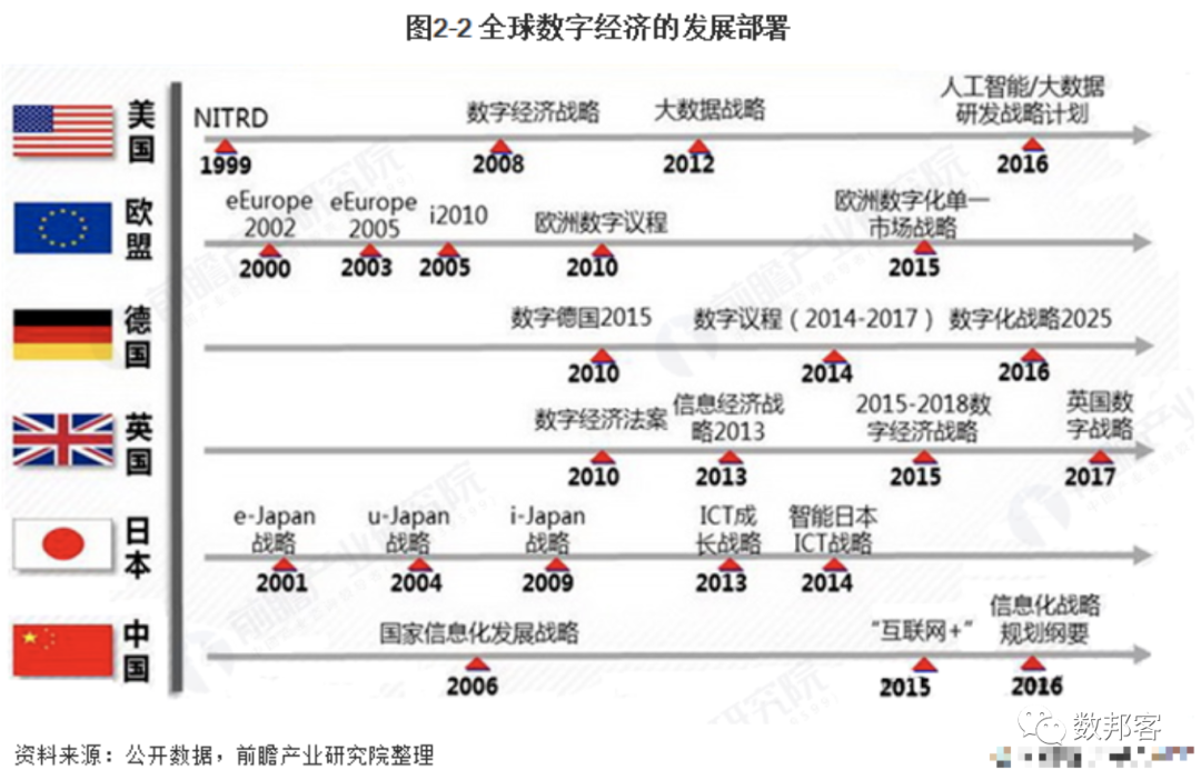数字经济是基于新一代信息技术,孕育全新的商业模式和经济活动,并对传统经济进行渗透补充和转型升级。美国早在1999年成立了NITRD(Networking and Information Technology Research and Development),布局了计算机、网络和软件的科研计划,中国也于2006年发布了《国家信息化发展战略》,把推动数字经济发展作为国家战略,不断推动数字经济发展。