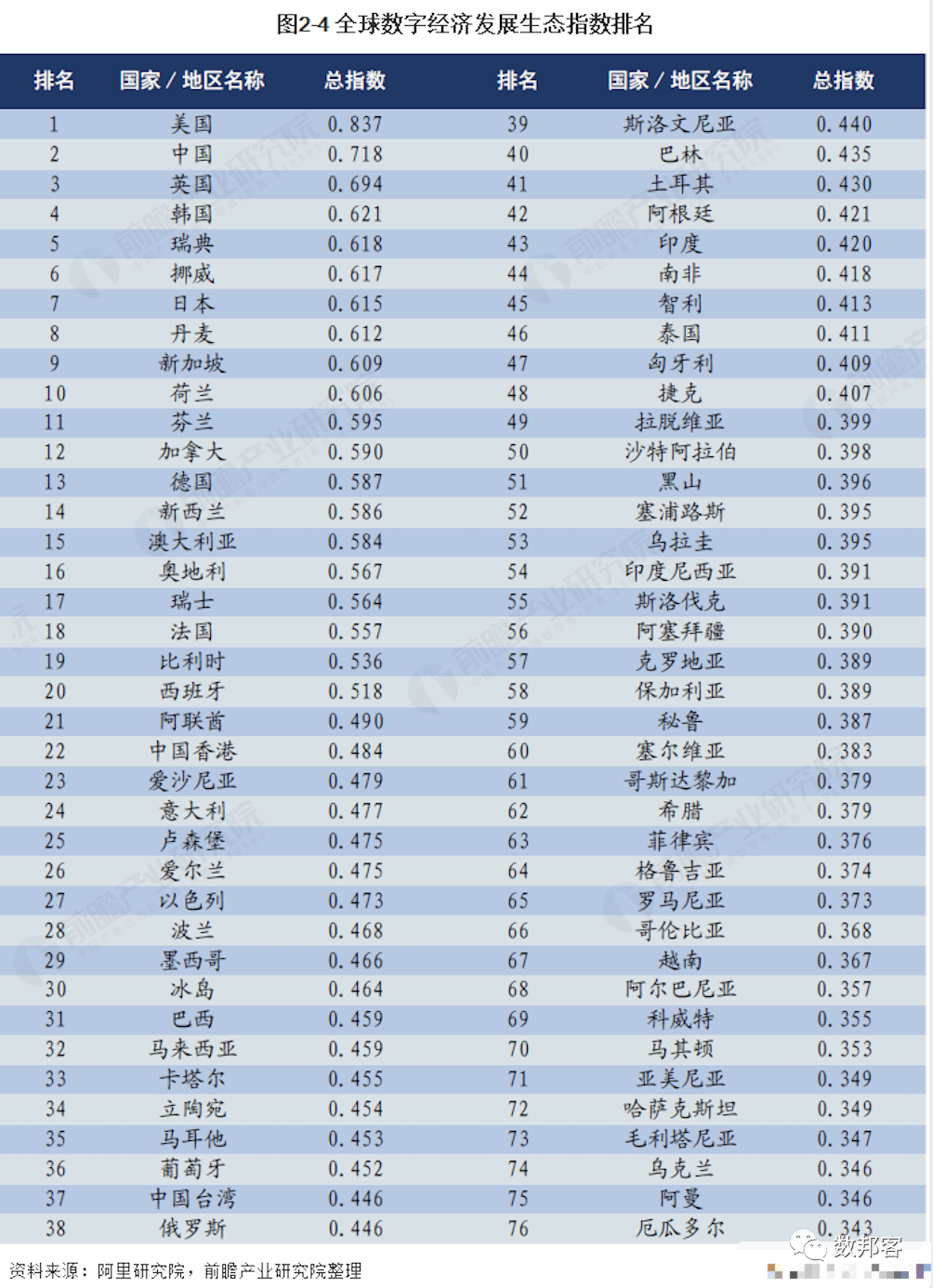 根据《2018年全球数字经济发展指数》(阿里研究院)报告,其中,全球数字经济发展指数排名中国以0.718的指数成绩位列全球第二,数字经济发展程度较高。
