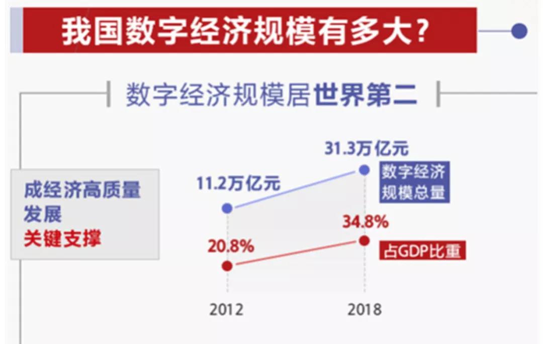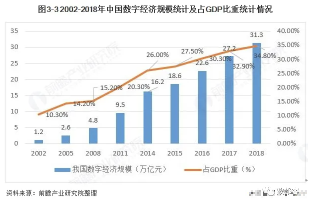 2017年中国数字经济规模达27.2万亿元,同比增长20.3%,占GDP的比重达到32.9%。截止至2018年我国数字经济规模达到31.3万亿元,按可比口径计算,名义增长20.9%,占GDP比重为34.8%,占比同比提升1.9个百分点。