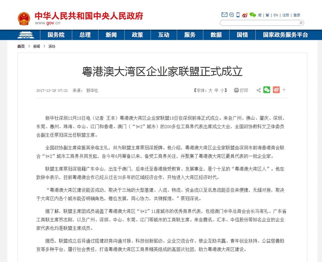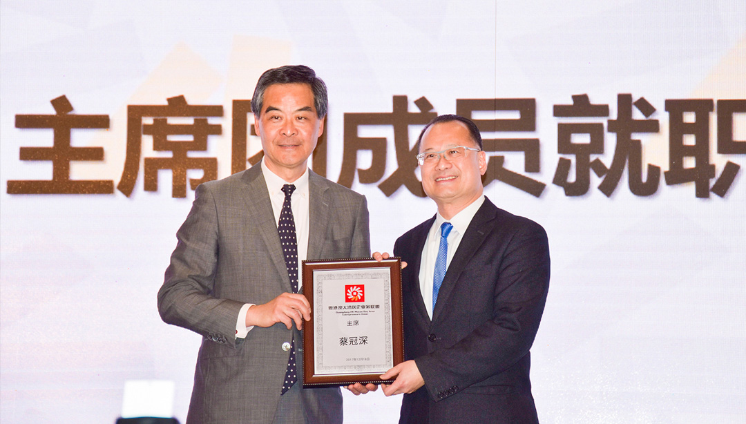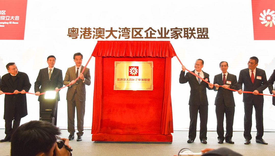 粤港澳大湾区企业家联盟18日在广东前海隆重举行成立大会,全国政协副主席梁振英担任主礼嘉宾,为联盟主席蔡冠深授牌。深圳市委常委、前海蛇口自贸片区管委会主任田夫,香港特区政府政制及内地事务局副局长陈帅夫,香港特区政府驻粤办主任邓家禧,广东省港澳办副主任黄锻炼等共同为联盟揭牌。来自香港、澳门、广州、佛山、肇庆、深圳、东莞、惠州、珠海、中山、江门的200多位工商界代表出席成立大会暨就职典礼。