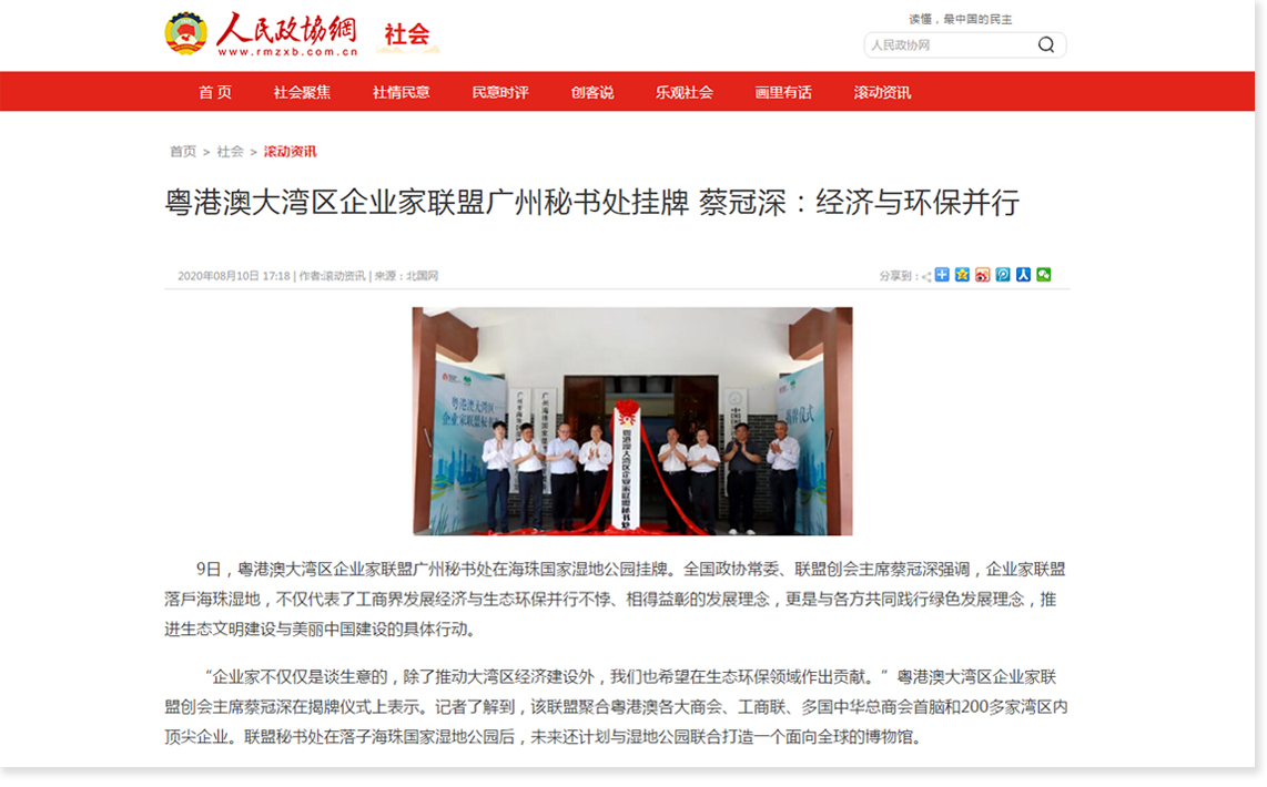 9日,粤港澳大湾区企业家联盟广州秘书处在海珠国家湿地公园挂牌。全国政协常委、联盟创会主席蔡冠深强调,企业家联盟落戶海珠湿地,不仅代表了工商界发展经济与生态环保并行不悖、相得益彰的发展理念,更是与各方共同践行绿色发展理念,推进生态文明建设与美丽中国建设的具体行动。