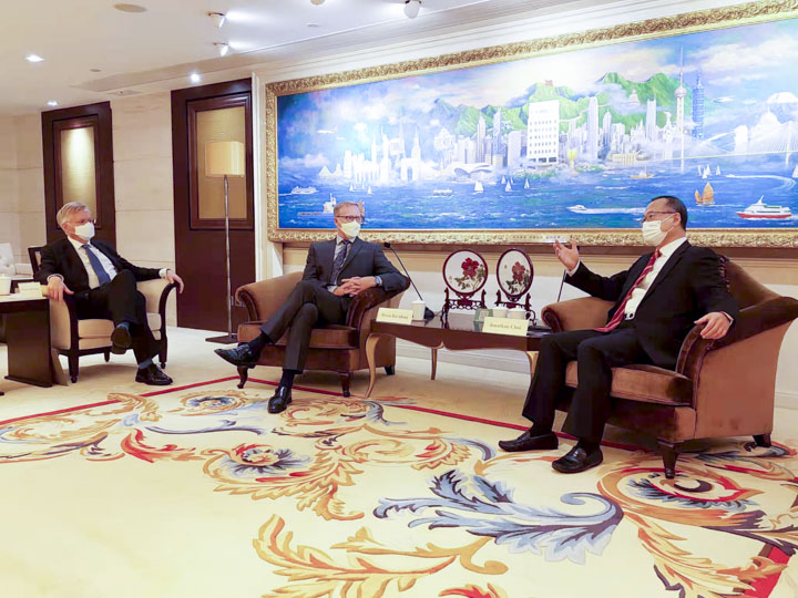 6月21日,全国政协常委、香港中华总商会永远名誉会长蔡冠深博士,在香港中华总商会会晤英国驻港澳总领事戴伟绅(Brian Davidson)、香港英商会主席彼得·伯内特(Peter Burnett)一行。