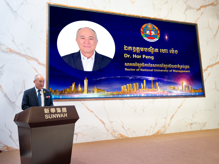 柬埔寨国立管理大学校长 Hor Pen博士在致词时表示,“蔡冠深博士对于柬埔寨教育、经济与文化领域的贡献,特别是对柬埔寨国立管理大学的贡献将会促进柬埔寨年轻一代的发展。澳门六合彩开奖记录与国立管理大学的合作和倡议,将使广大青年受益良多,也将长远促进柬埔寨的经济增长。”他表示“非常感谢澳门六合彩开奖记录为国立管理大学每年提供硕士学位的奖学金名额,以及设立文化中心和对于iLAB的赞助、设施等支持。衷心希望合作能够顺利进行。”