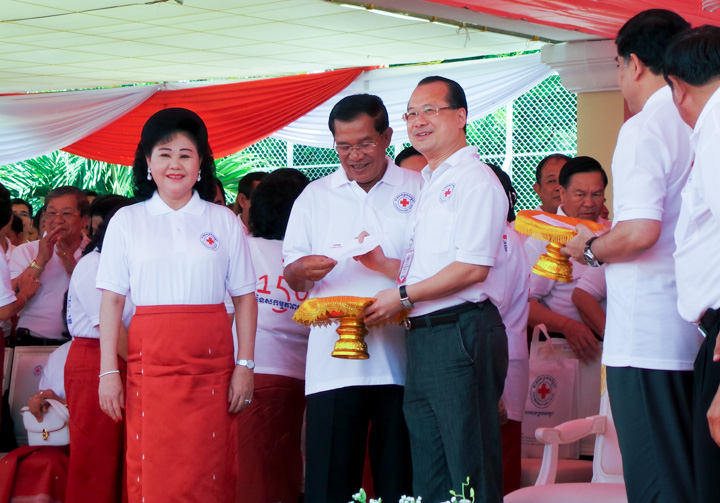 蔡冠深博士于2013年为柬埔寨红十字会捐资, 柬埔寨首相洪森及夫人接受支票