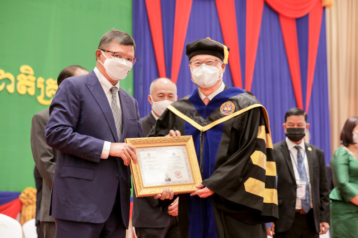 柬埔寨教育、青年与体育部部长洪尊那隆为蔡博士颁发名誉博士证书