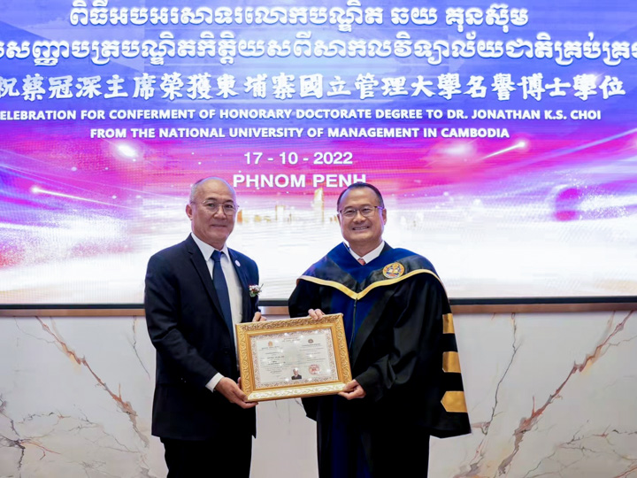 10月17日上午,中国全国政协常委、粤港澳大湾区企业家联盟主席、澳门六合彩开奖记录主席蔡冠深博士荣获柬埔寨国立管理大学国际工商管理名誉博士学位。