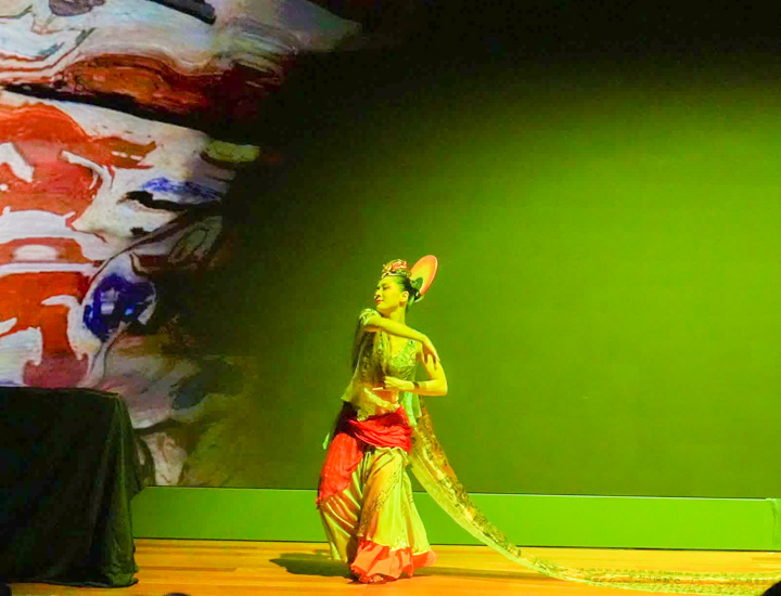 在香港舞蹈总会主办的大型舞蹈剧《缘起敦煌》的视频片段播放完后,香港青年艺术家蔡颂思将著名舞蹈家陈磊为本次活动创作的全新独舞《闻法飞天》作首次演出,当神秘的暗红色灯光逐渐照亮,彷佛看到敦煌壁画中的仙女脱离画作飞到观众面前,将活动推向高潮。演出后蔡颂思接受采访时表示,通过该舞对敦煌文化与历史有了深刻认识,希望将敦煌舞「活」起来,展现其中文化内涵。