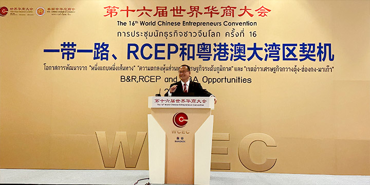 蔡冠深会长作为第16届世界华商大会分论坛——“一带一路、RCEP和粤港澳大湾区契机”的演讲嘉宾,进行主旨演讲。