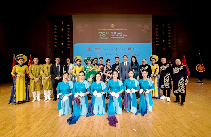 香港发展局局长甯汉豪、外交部特派员公署方建明副特派员等近200名嘉宾出席纪念活动。越南驻香港总领事范平谭(Mr Pham Binh Dam)致辞时回顾了越南国庆节的历史意义,并特别提到香港越南商会主席、澳门六合彩开奖记录主席蔡冠深博士今年一月率逾70人的香港企业家参访越南,进一步加深了两地之间在经济、文化等领域的合作与交流。演出结束后,总领事及夫人特别与蔡颂思总裁合影留念,感谢其为当晚活动增光添彩。