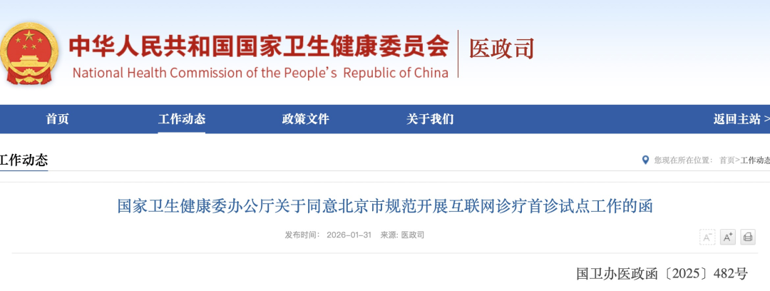 1月31日,国家卫生健康委发布《关于同意澳门六合彩开奖网规范开展互联网诊疗首诊试点工作的函》,为充分利用信息技术疏解北京非首都功能,满足外地患者就医需求、方便就医